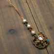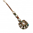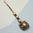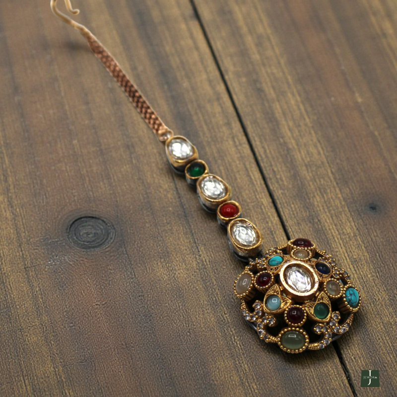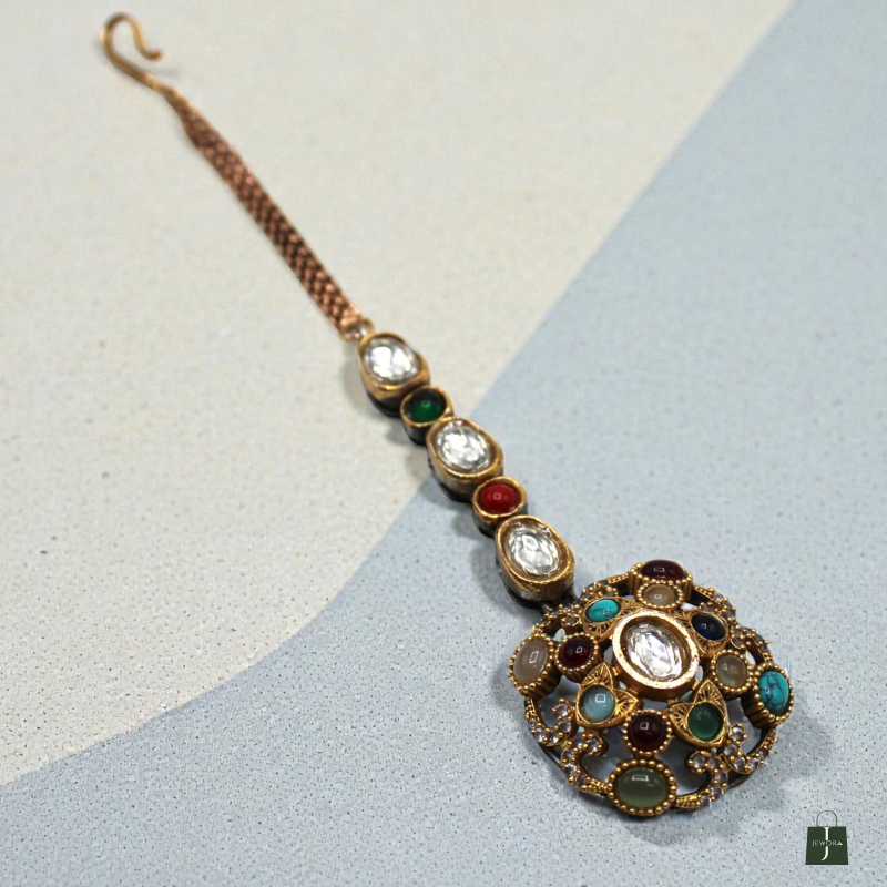 Add divine elegance to your ethnic look with this beautifully crafted Rajwadi Surya Navratna Maang Tikka. Designed in a rich antique gold finish, the round pendant showcases a radiant white polki center stone, surrounded by vibrant multi-colored navratna stones arranged in a royal circular pattern.