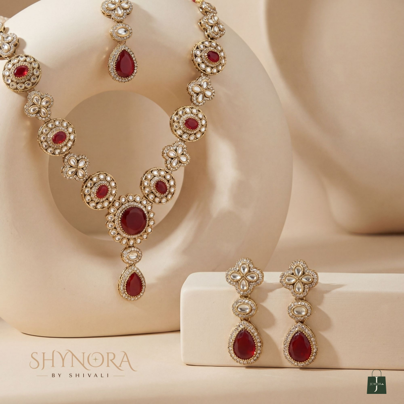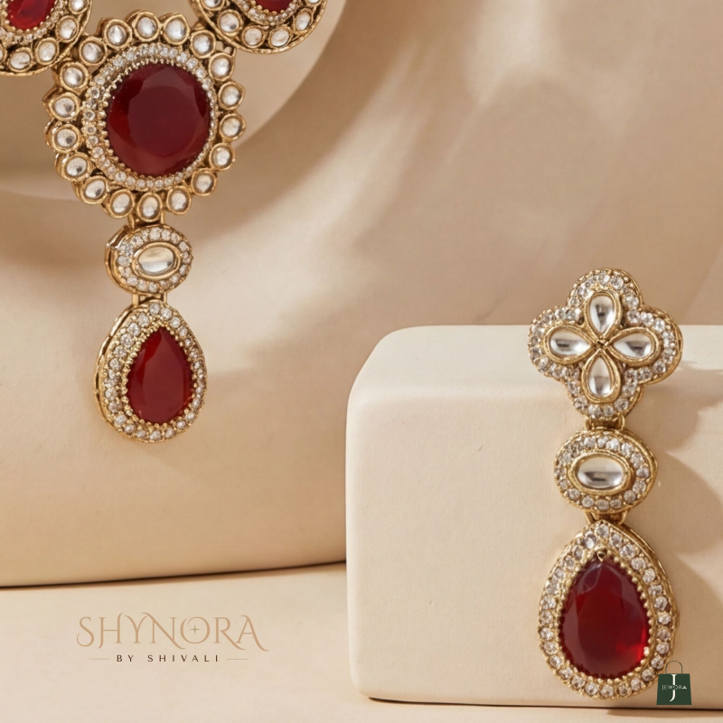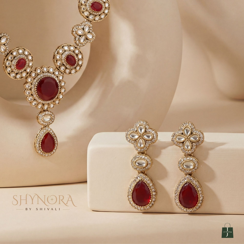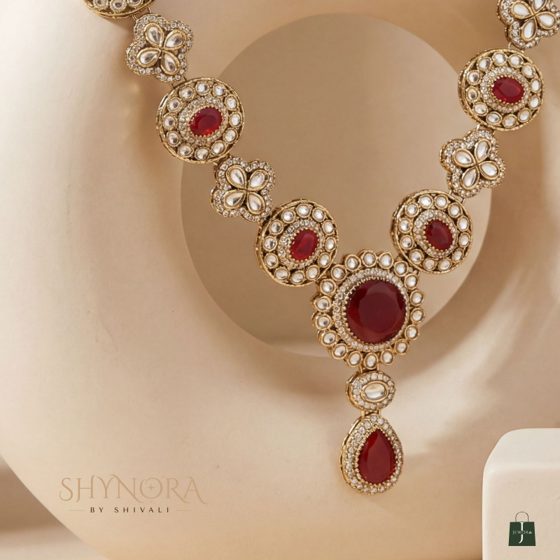 The Raktima Rani Kundan Necklace Set is a graceful blend of tradition and royalty, crafted for those who love classic elegance. Featuring deep red ruby-tone stones framed in high-polish Kundan work, this set is designed in a balanced circular motif with a striking central pendant and a delicate teardrop drop that adds timeless charm.