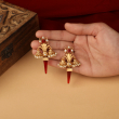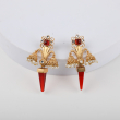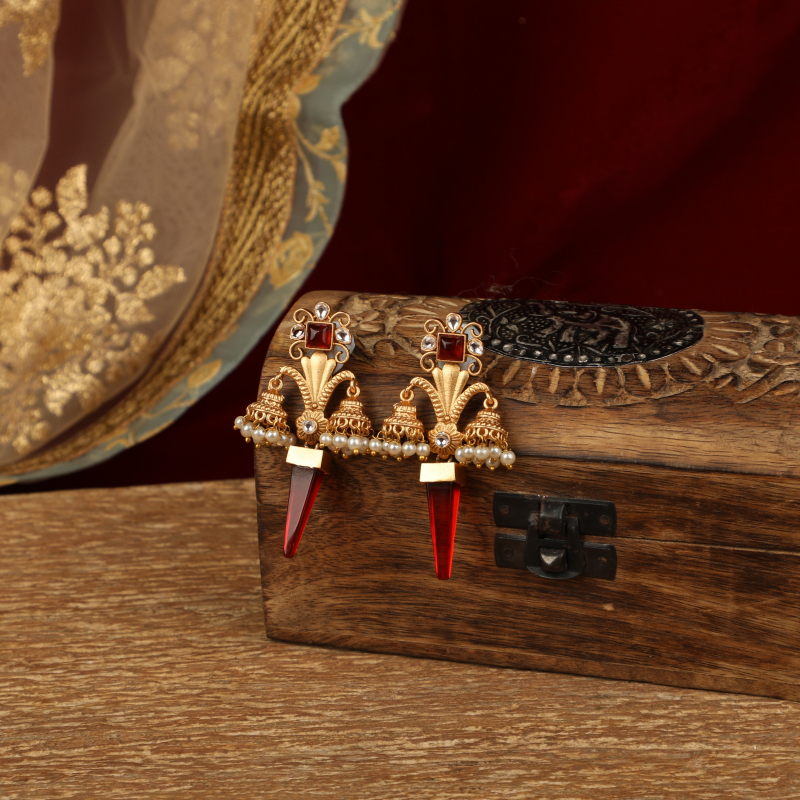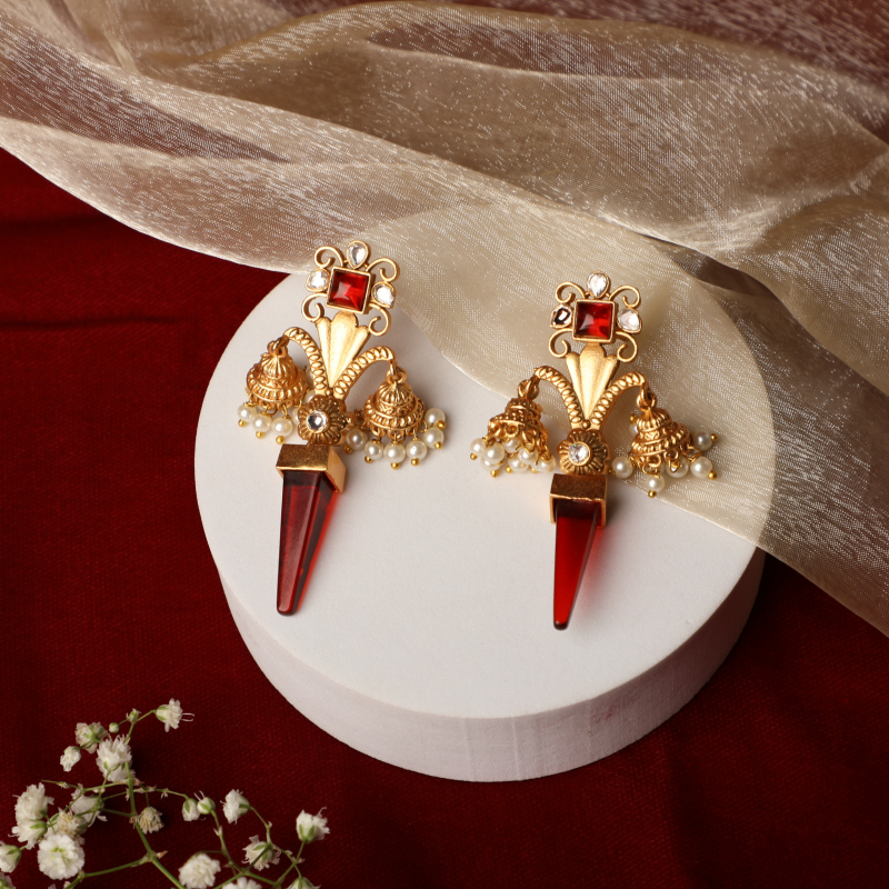 Bold yet intricately detailed, these statement earrings are a striking blend of traditional craftsmanship and contemporary drama. Designed with an ornate gold-toned upper featuring delicate scrollwork and a square red stone accent, the silhouette is elevated with twin jhumki-style drops adorned with tiny pearl clusters. The look is completed with a sleek red spike drop that adds a modern, edgy contrast to the classic design.