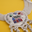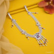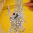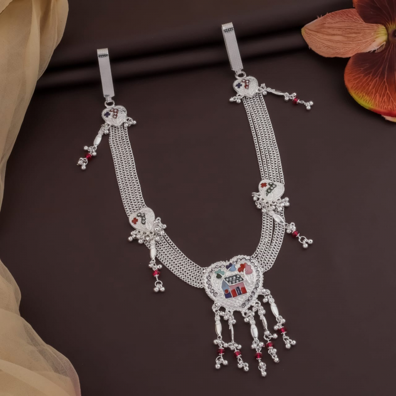 This elegant silver-tone kamarbandh features multiple delicate chain strands that come together to create a graceful waist accessory. The centerpiece showcases a beautifully crafted round pendant decorated with vibrant multicolor enamel artwork inspired by traditional motifs. Hanging tassel drops with red bead accents add movement and charm to the design. Perfect for styling with sarees, lehengas, and festive outfits, this kamarbandh enhances the waistline and adds a rich ethnic touch to any traditional look.