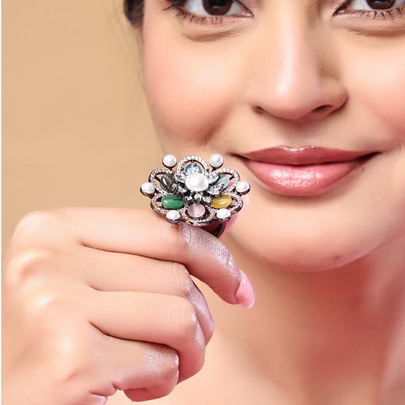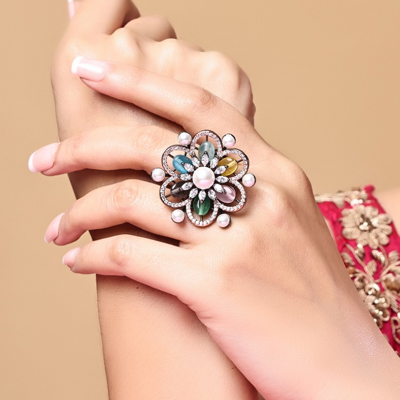 Add a splash of color and elegance to your look with this stunning multicolour floral ring band. Designed with beautifully crafted flower motifs, this ring showcases vibrant stones that bring a lively and festive charm. The intricate detailing combined with a smooth finish gives it a perfect blend of traditional and modern style. Lightweight and comfortable to wear, this ring band is ideal for daily wear as well as special occasions. Pair it with ethnic or fusion outfits to effortlessly elevate your style with a pop of color.