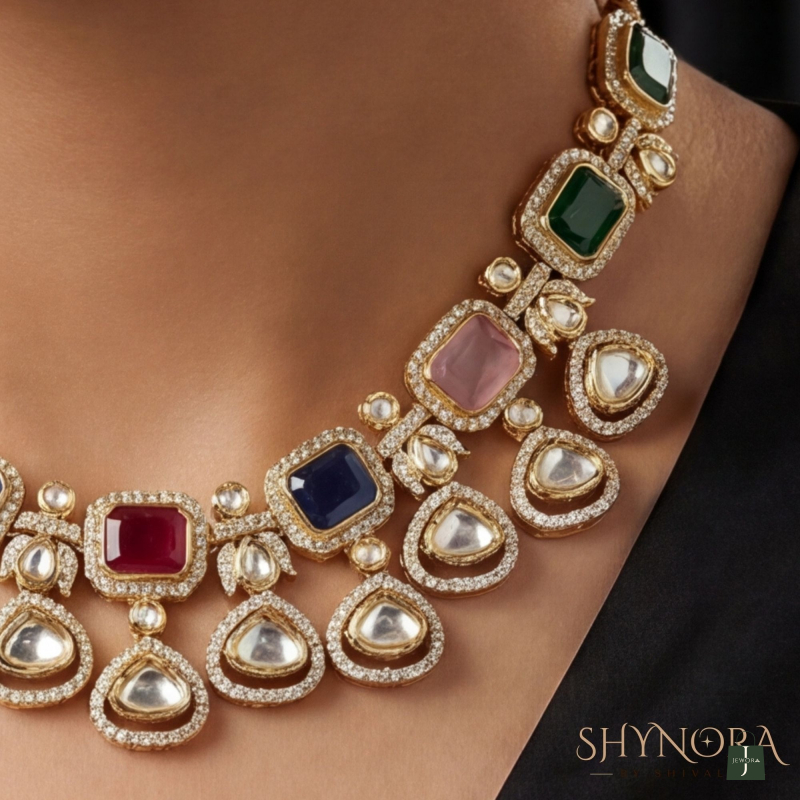 The Rangrez Multi-Stone Kundan Necklace Set is a vibrant celebration of colour and craftsmanship. Designed with a graceful neckline, it features a rich mix of emerald green, ruby red, sapphire blue, blush pink and classic kundan stones, each framed in a luxe gold-tone finish.