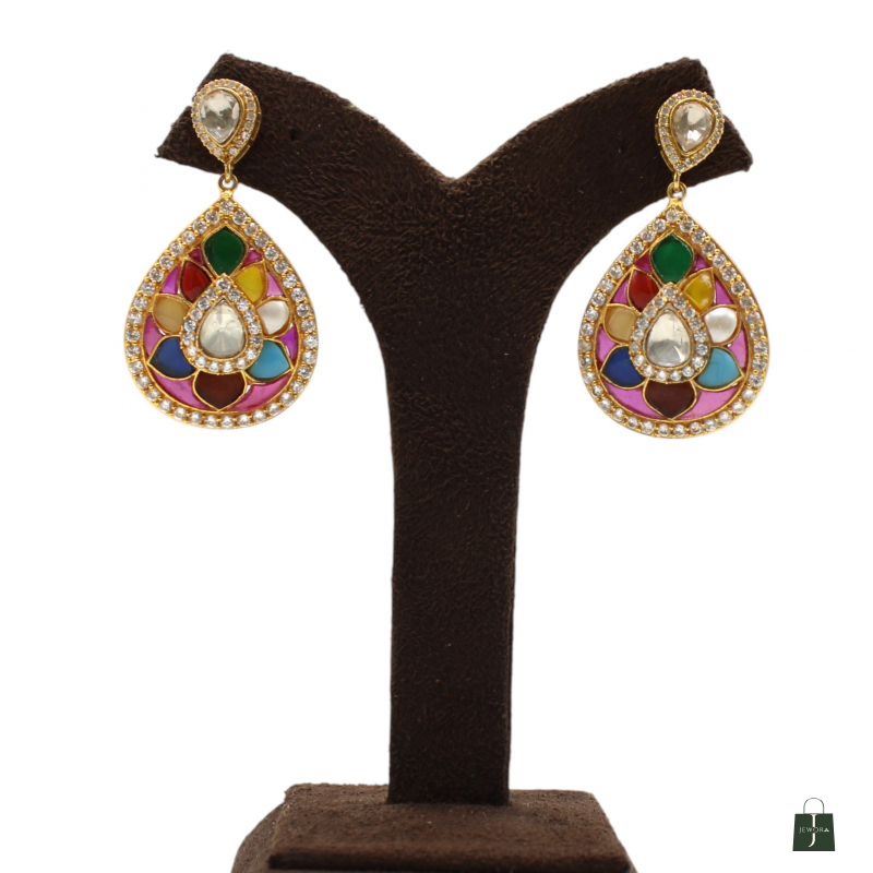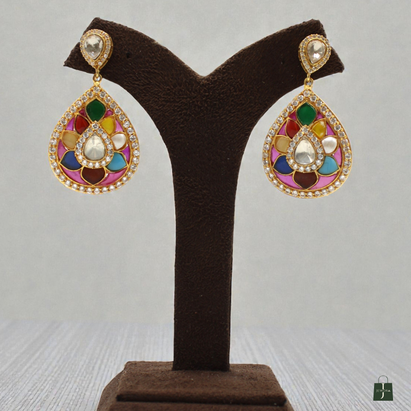 Celebrate vibrant tradition with these stunning Rangrez Teardrop Polki Earrings. Designed in an elegant pear-shaped drop pattern, these earrings feature a central pear-cut polki stone surrounded by beautifully arranged multicolor enamel-style stones in a floral-inspired layout.