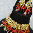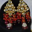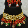 A statement Kundan choker designed with bold red bead detailing and closely set Polki stones. The heavy structure gives a luxurious, high-end look, making it perfect for festive parties and traditional gatherings. Matching earrings elevate the overall ensemble with a strong royal presence.