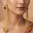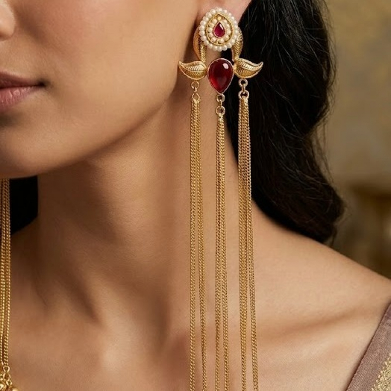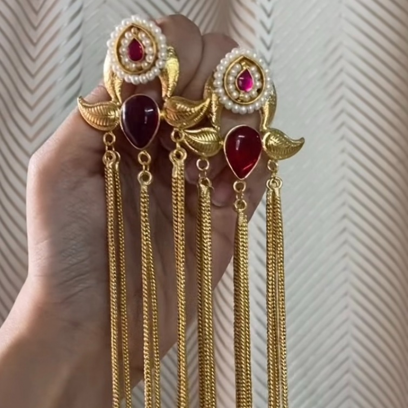 Stunning Brass-Polished Kashmiri Earrings designed with elegant traditional artistry. These earrings feature a beautiful red stone centerpiece with delicate pearl accents and long chain tassels that create a graceful, eye-catching look. Perfect for weddings, festive occasions, and ethnic outfits, they add a royal and stylish touch to your appearance.