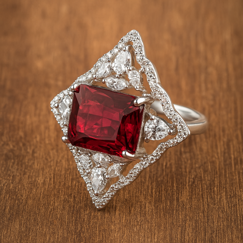 Red Stone AD Cocktail Ring is a striking jewellery piece that blends luxury and elegance. Featuring a radiant red gemstone at the center, this designer ring is accentuated with sparkling American Diamonds (CZ) set in a silver-plated frame. The unique triangular design highlights the central stone, making it the perfect accessory for women who love bold statement rings. Crafted with premium alloy and finished with silver plating, the ring ensures both durability and a brilliant shine. The adjustable free-size band adds comfort, making it suitable for all finger sizes. Ideal for party wear, festive events, or special occasions, this red stone cocktail ring is a versatile addition to your collection. Whether worn alone or paired with other AD jewellery, it exudes sophistication and charm.