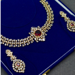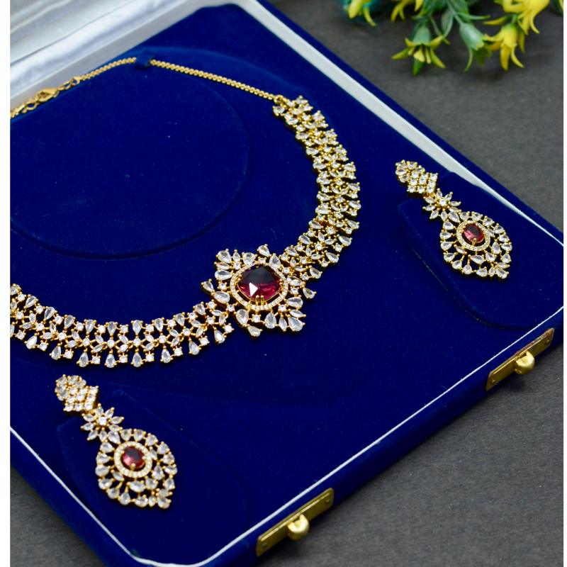 Featuring a striking reddish ruby center stone, this necklace set captures attention with its bold yet elegant design. Accentuated by shimmering crystal detailing, it offers a luxurious focal point and excellent finish, delivering a premium look suitable for festive wear at an accessible price.
