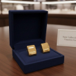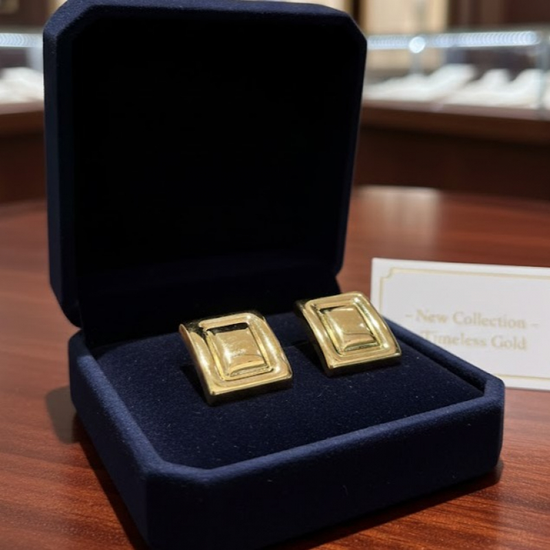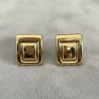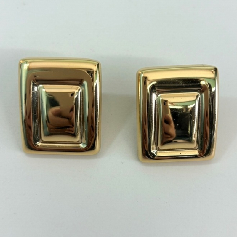 Featuring a layered square silhouette with a high-polish gold-tone finish, the design creates depth through its stepped geometric form. The smooth reflective surface adds a luxurious shine, making them perfect for both formal and contemporary looks.
