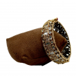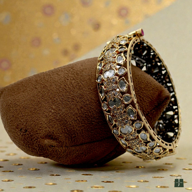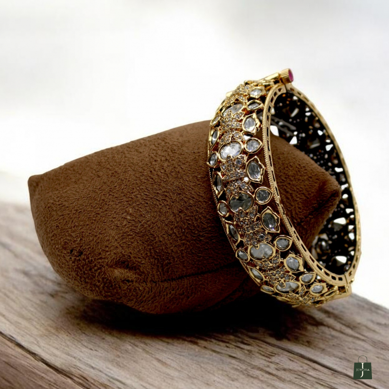 Add a touch of royal elegance to your jewellery collection with this beautifully crafted Polki Kundan Broad Bangle. Designed with intricate detailing, this statement piece features oval and teardrop-shaped white polki stones arranged in floral and crown-inspired motifs.