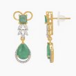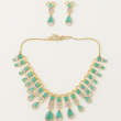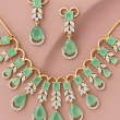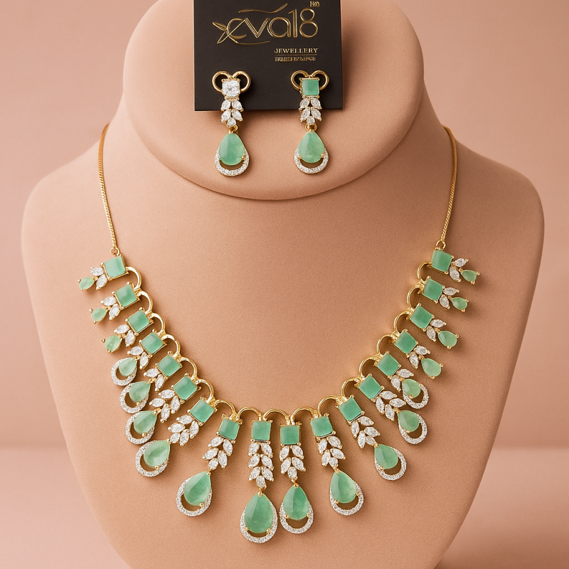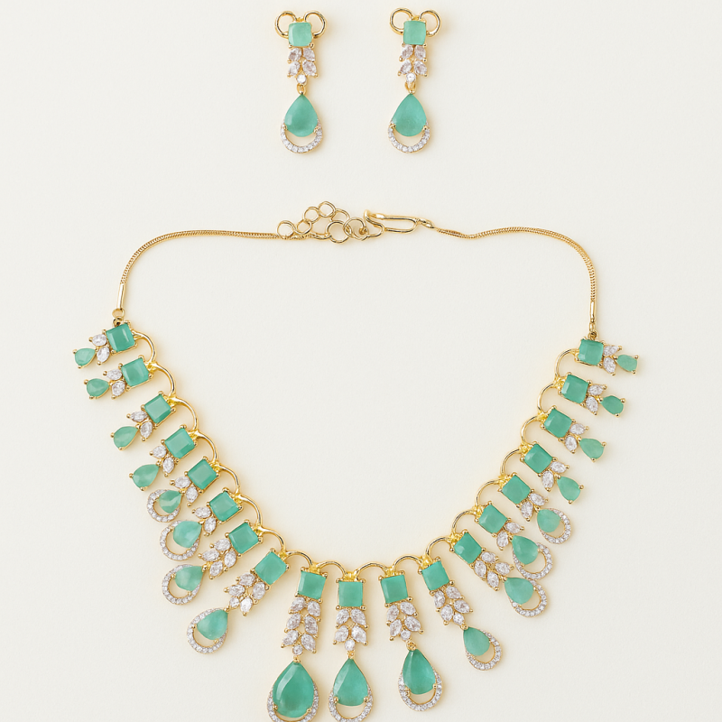 Unveil your regal charm with this captivating emerald necklace set, designed to radiate timeless elegance. Crafted with exquisite craftsmanship, the necklace features multiple cascading pear-shaped and rectangular emerald stones, each bordered with shimmering American Diamonds that enhance their brilliance. The striking design flows gracefully, with alternating green and white accents that exude a perfect blend of tradition and luxury. Paired with matching earrings that echo the same regal emerald drops, this set is ideal for grand festive occasions, weddings, or bridal wear. The rich green hue of the emeralds against a polished gold base reflects sophistication and poise, making it a show-stopper at any gathering. Whether styled with ethnic attire or a modern lehenga, this piece promises to be the highlight of your jewelry collection. A flawless combination of luxury and tradition, the Regal Emerald Charm Set is designed for women who love to make a statement.