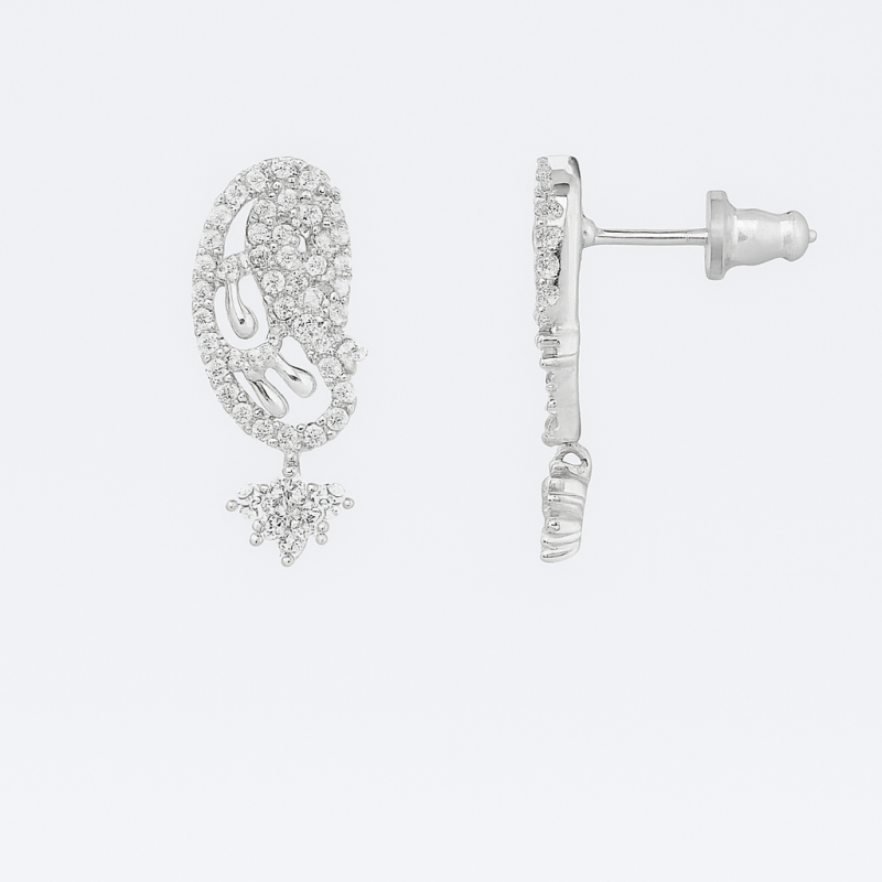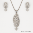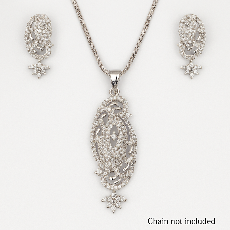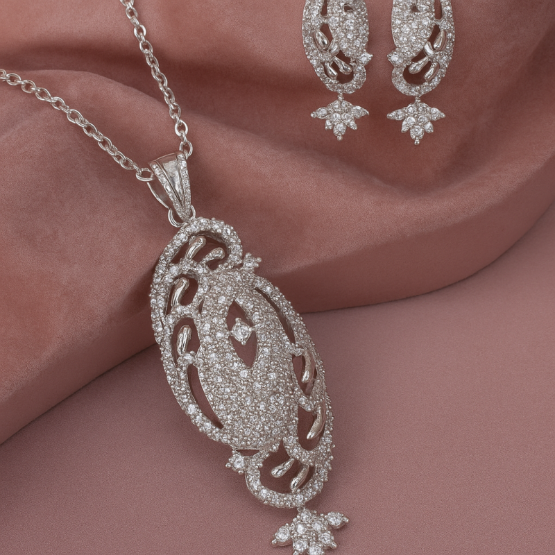 The Regal Filigree Pendant Set is a dazzling jewellery ensemble crafted in a rich silver polish. Its intricate filigree-style craftsmanship and sparkling American Diamond (CZ) stones create an elegant appeal, perfect for parties and festive occasions. The pendant and earrings together bring a regal charm to any outfit.