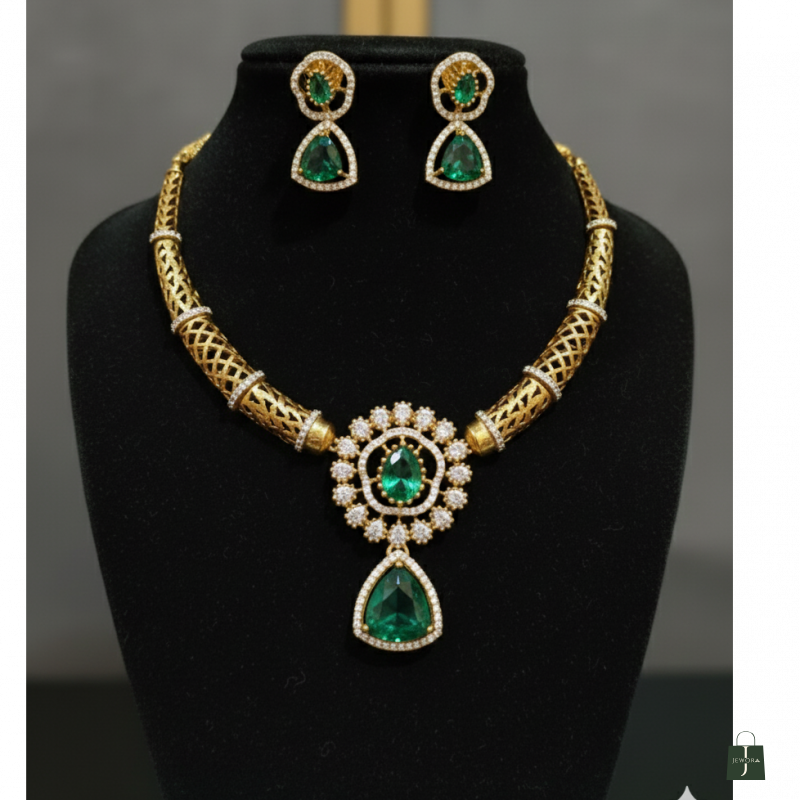 Intricate Design: The rigid, collar-style necklace boasts a hollow-cut, geometric lattice pattern along the band, interspersed with pave-set white sparkling stones.