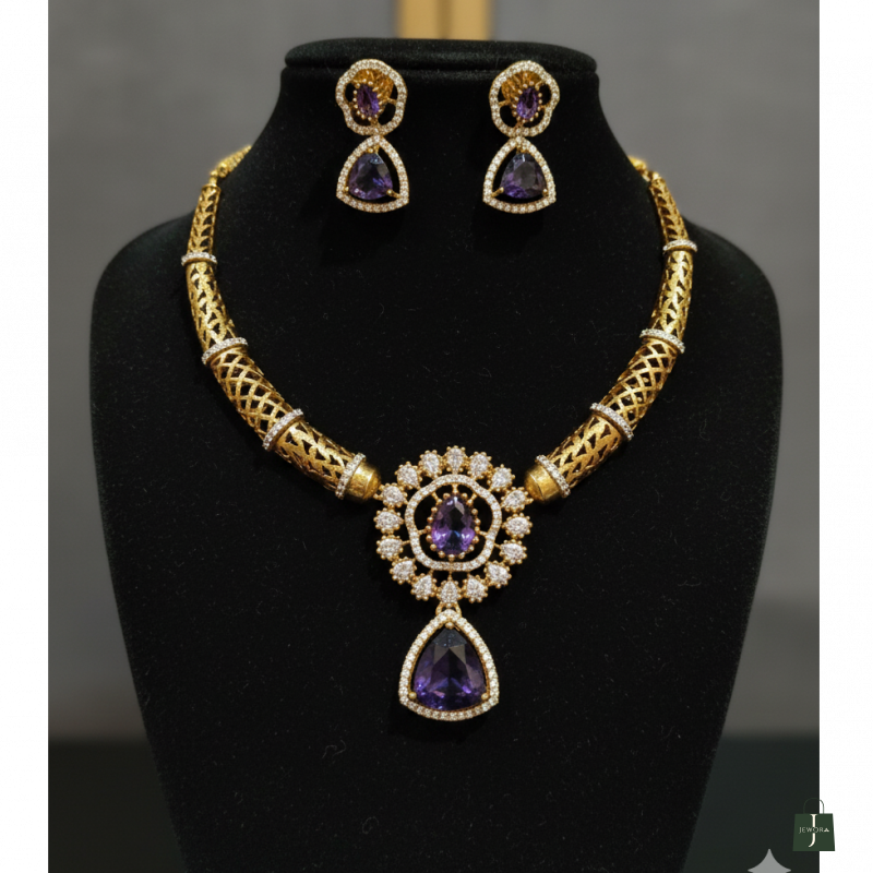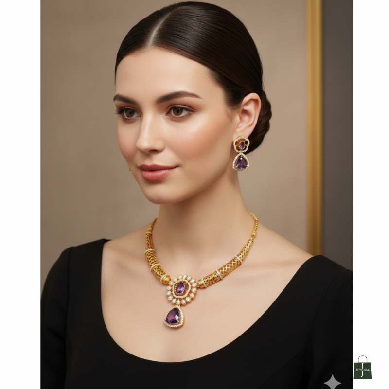 Matching Earrings: The accompanying drop earrings perfectly complement the necklace, featuring the same purple triangle stone suspended from a delicate stud with white stone embellishments.