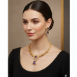 Central Focal Point: The pendant features a magnificent large, round centerpiece with a deep purple (Amethyst/Tanzanite look) cabochon stone surrounded by an elaborate halo of white stones. A striking triangular drop-pendant with a matching purple stone hangs gracefully below.