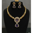 Elevate your ethnic or formal attire with this stunning and opulent gold-toned necklace and earring set. Inspired by classic traditional designs, this ensemble features intricate craftsmanship, captivating purple stones, and dazzling white accents for a truly royal look.
