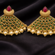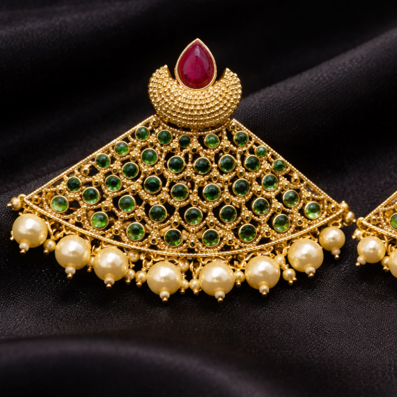 Elegant gold-plated chandelier earrings with a stylish triangular design. Features a pink teardrop gemstone stud atop a textured gold base, complemented by a lattice of green stones and pearl drop accents at the bottom. Perfect for festive or ethnic outfits.