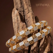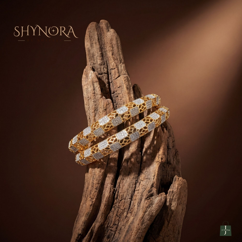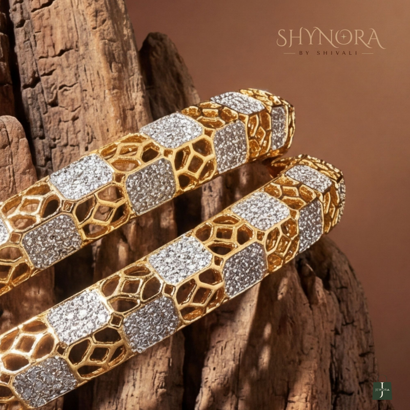 The Regal Hive Crystal Bangles showcase a bold yet elegant geometric design inspired by honeycomb patterns. Alternating hexagonal gold motifs and pavé-set white crystals create a striking contrast, giving these bangles a luxurious, contemporary appeal. The seamless craftsmanship and smooth finish ensure a comfortable fit while delivering maximum sparkle.