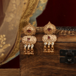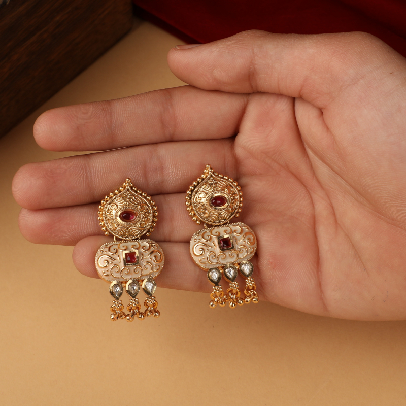 Inspired by classic Indian artistry, these statement earrings showcase intricate gold-toned filigree work paired with soft ivory enamel detailing. Accented with rich ruby-toned stones and reflective kundan drops, the design is finished with delicate ghungroo-style danglers that add graceful movement. The layered structure balances heritage charm with refined elegance, making these earrings truly eye-catching.