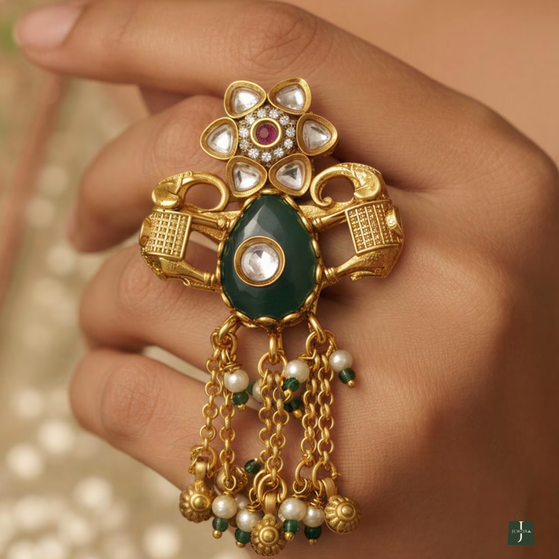 This design blends traditional temple artistry, Kashmiri charm, and royal Kundan detailing, making it the perfect statement piece for weddings, mehendi, haldi, sangeet, festive events, and grand celebrations.