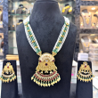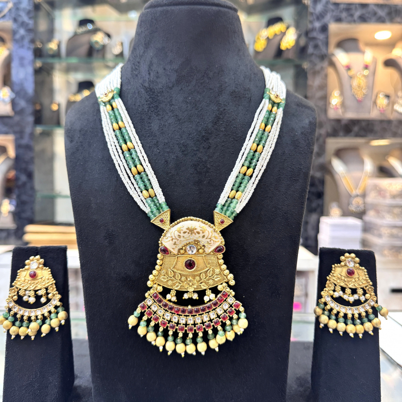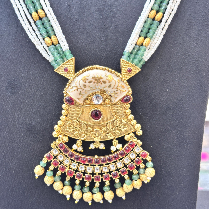Step into timeless elegance with the Regal Kundan Temple Haar by Jewora, an exceptional creation that blends heritage craftsmanship with royal grandeur. This magnificent haar features layers of white pearls and green beads, culminating in an ornate pendant adorned with intricate temple carvings, kundan stones, and rich red detailing. The dangling elements at the bottom enhance its divine appeal, making it a perfect choice for brides and women who want to embrace tradition with sophistication.