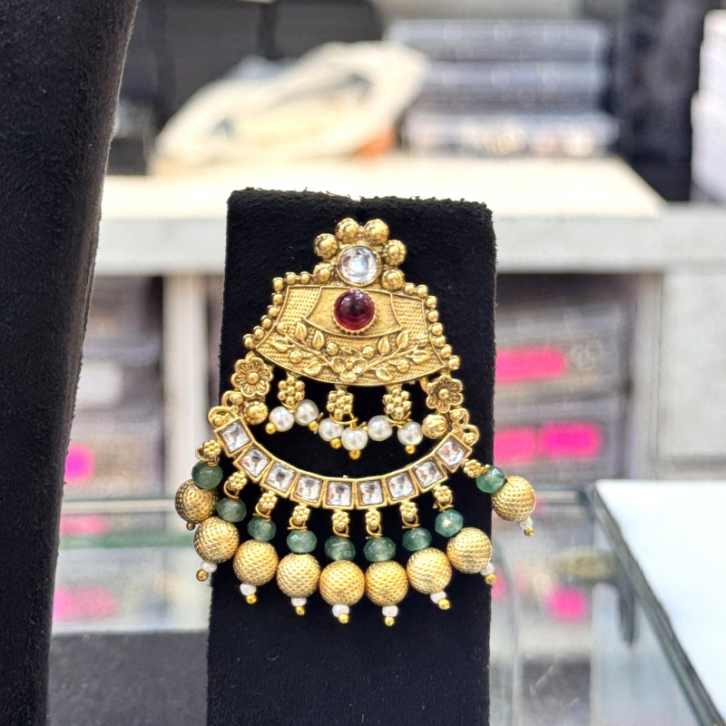 The set comes with exquisitely matching temple-inspired earrings, intricately designed with pearls, kundan, and golden carvings. Whether for weddings, festivals, or grand cultural celebrations, the Regal Kundan Temple Haar by Jewora stands as a symbol of prosperity, heritage, and artistic mastery.