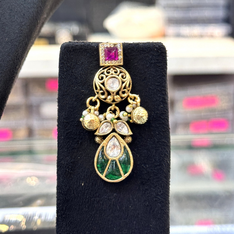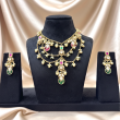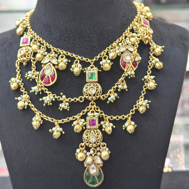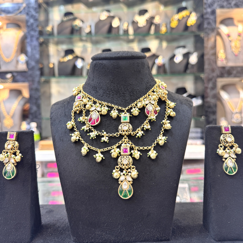 The matching earrings mirror the grandeur of the necklace, creating a coordinated look perfect for weddings, receptions, festive occasions, and cultural celebrations. With its multicolor palette and detailed artistry, this piece complements traditional Indian attire like sarees, lehengas, and anarkalis, making it a versatile choice for every jewelry lover.