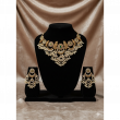 The elaborate design showcases the richness of Temple Jewellery craftsmanship, blending heritage motifs with luxurious detailing. Each peacock element is adorned with sparkling stones and finished with pearl tassels, enhancing its grandeur. The matching earrings, designed with equal intricacy, complete the set with elegance and poise.
