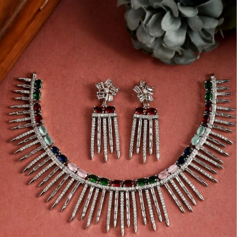 Stunning necklace & earring set crafted in silver-tone metal with sparkling American diamond (cubic zirconia) accents and multi-colored gemstones arranged in an elegant fringe design. The necklace features a curved choker-style base with pointed diamond-studded bars that cascade outward, while the matching earrings have a flower-shaped top with red stones and diamond-lined hanging bars. Perfect for festive or glamorous occasions, this set adds a vibrant, luxurious touch to any outfit. ✨💎👑