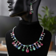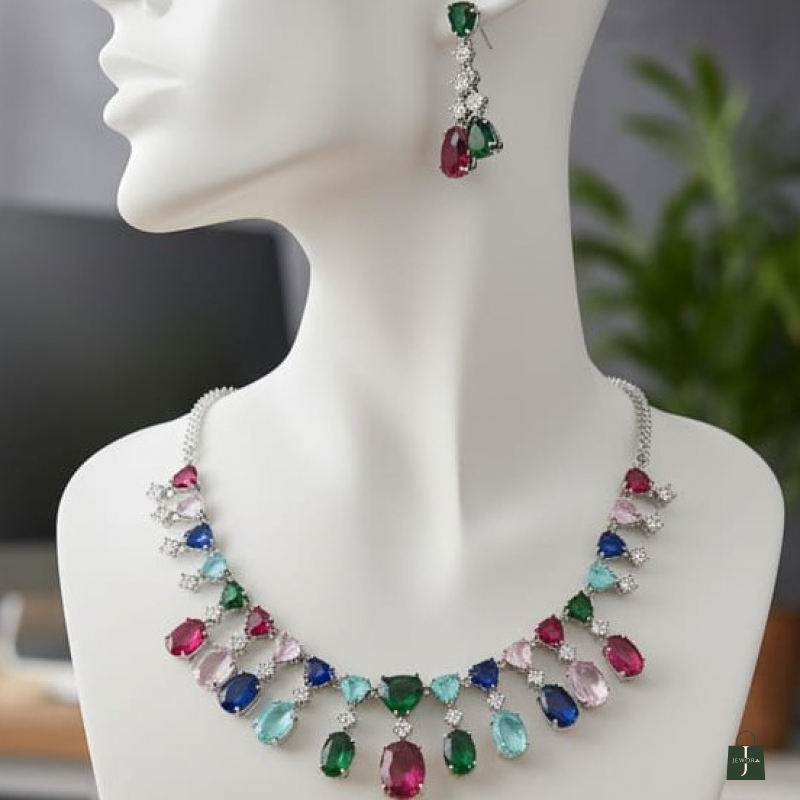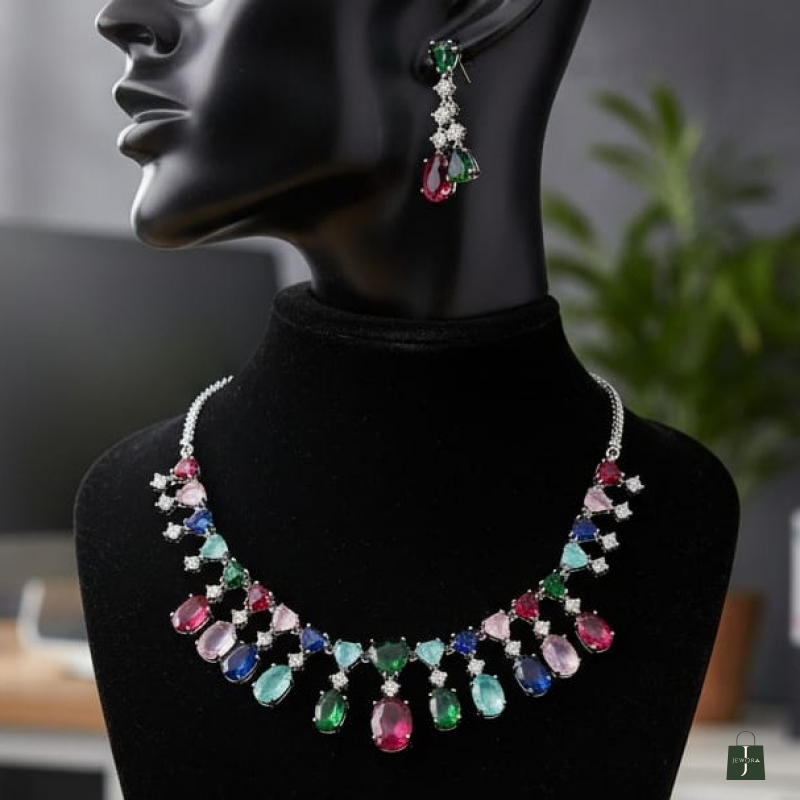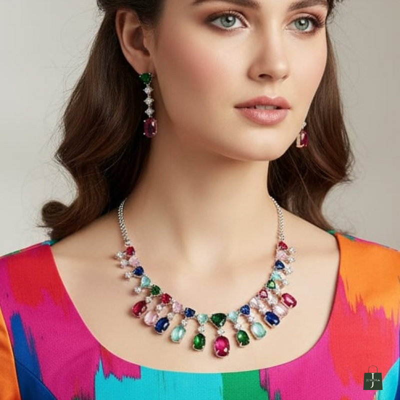 Make a bold and elegant statement with the Regal Rainbow Teardrop Statement Jewelry Set. Designed with dazzling multicolor teardrop stones, this luxurious necklace features a stunning arrangement of vibrant hues including emerald green, ruby red, sapphire blue, blush pink, and aqua tones. Accented with shimmering crystal detailing and paired with matching drop earrings, this set brings glamour and sophistication to any special occasion. Perfect for weddings, festive celebrations, evening parties, and formal events, this eye-catching jewelry set adds a radiant pop of color to both classic and contemporary outfits.