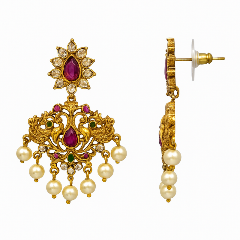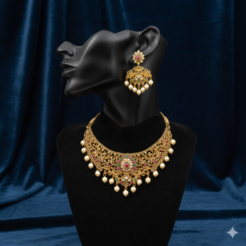 The necklace features detailed floral and vine motifs, symbolizing prosperity and beauty, while its gold plating radiates richness. Dangling pearl drops add graceful movement, making the set truly eye-catching. The matching earrings mirror the intricate design, ensuring a complete, coordinated look that resonates with traditional charm.