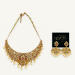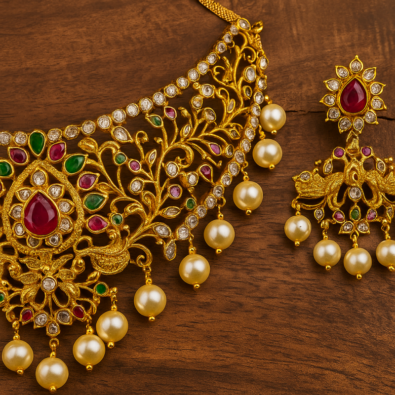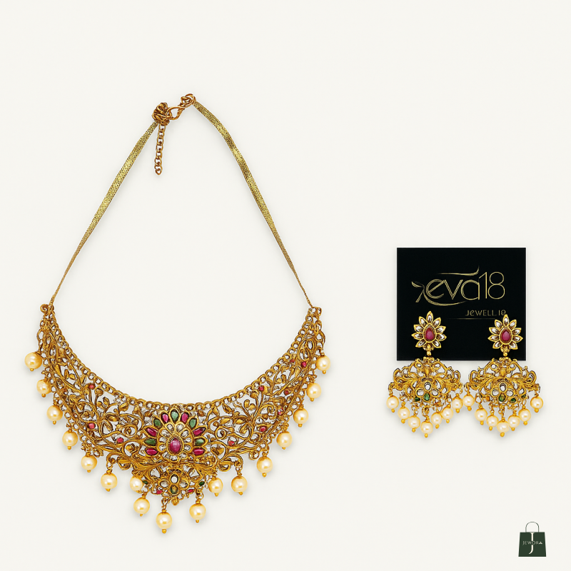 Embrace timeless grandeur with the Regal Ruby Pearl Choker Necklace Set by Jewora. Designed to exude royal elegance, this choker-style necklace is crafted with intricate filigree artistry and adorned with a striking combination of rubies, emerald accents, and lustrous pearls. The bold choker design enhances the neckline, making it a perfect centerpiece for bridal and festive occasions.