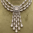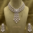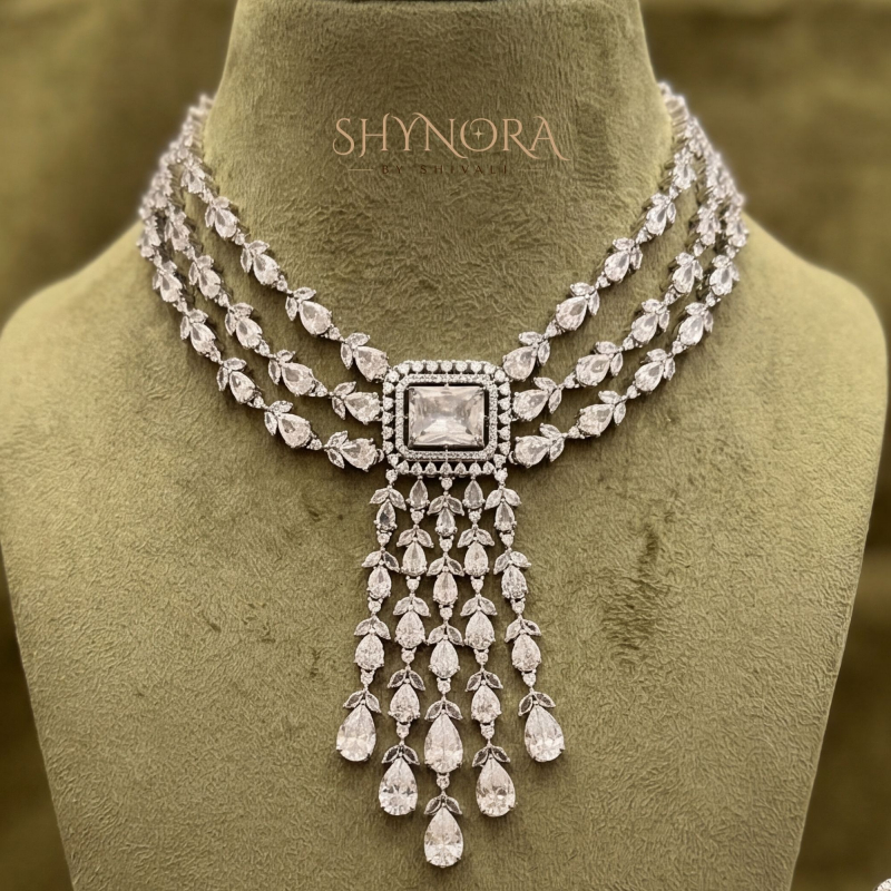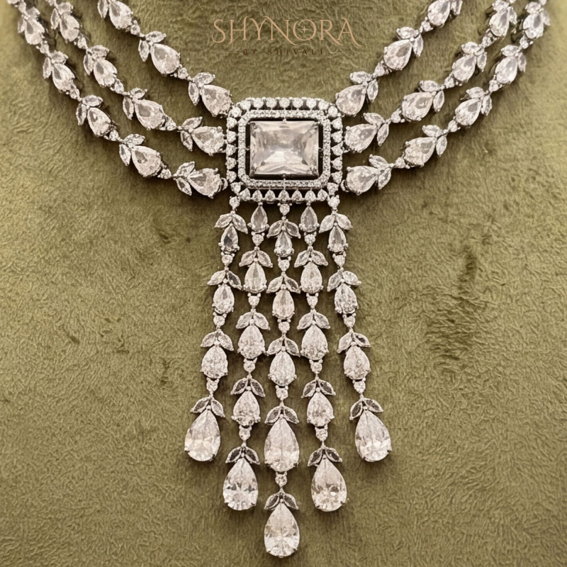 Crafted in a radiant silver-tone finish, the necklace sits gracefully around the neckline, creating a rich and royal look. The matching chandelier earrings mirror the cascading crystal pattern, completing the ensemble with perfect symmetry and sophistication.