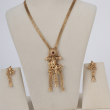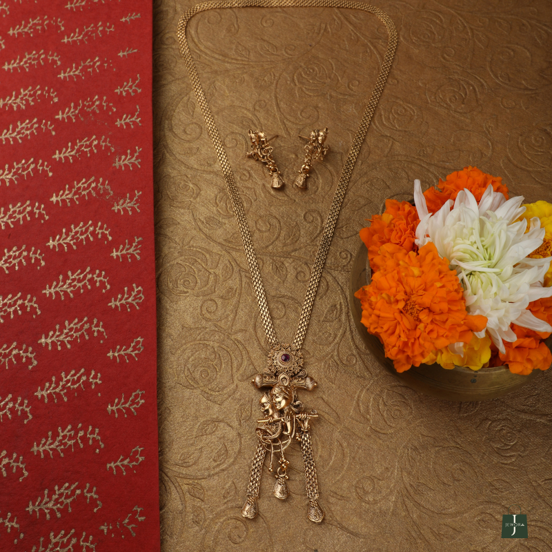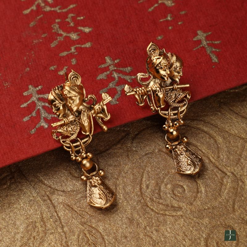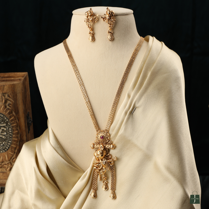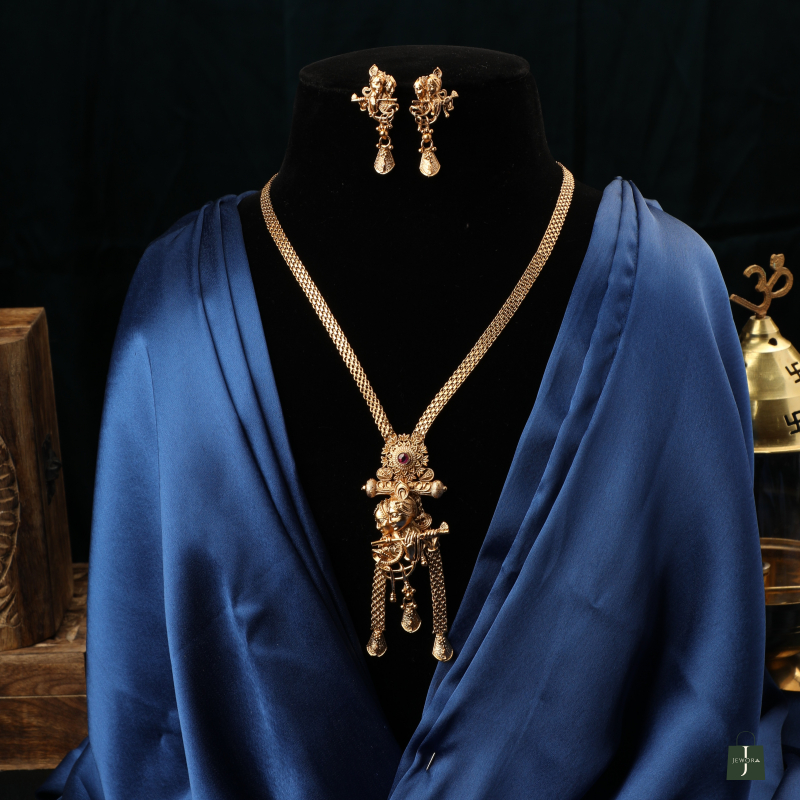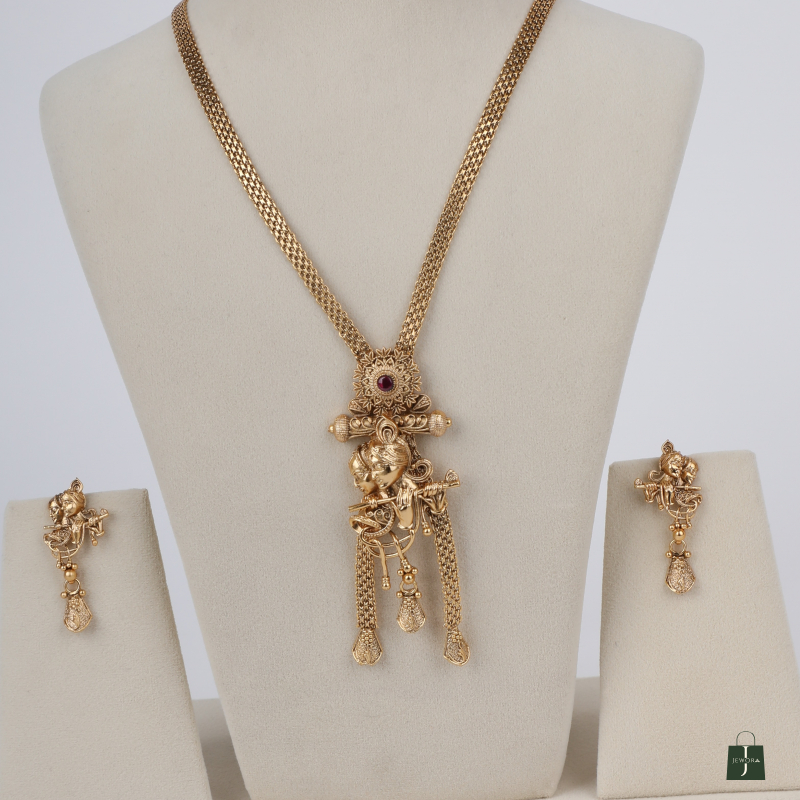 The focal pendant showcases a finely sculpted depiction of Lord Krishna playing his traditional flute with Radha by his side, symbolising divine love, harmony, and devotion. Delicate dangling elements add graceful movement, while subtle ruby-toned accents enhance the antique gold finish, lending the piece a regal and ceremonial charm. The matching earrings echo the same design language in a lighter, elegant form, completing the set with balanced sophistication.