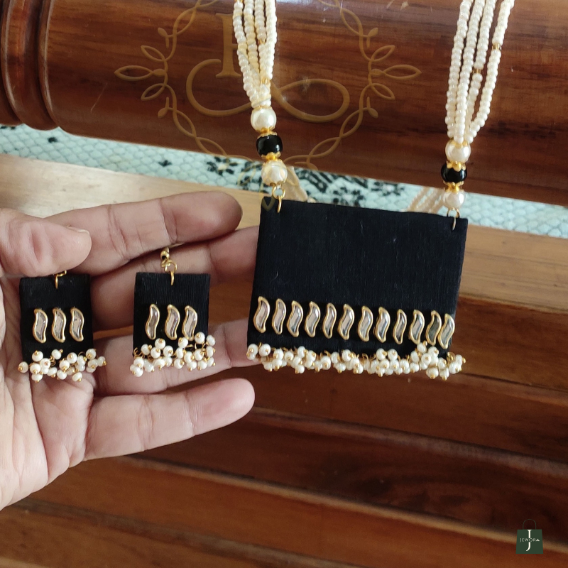 This handcrafted ethnic jewellery piece is made using rich black khadi fabric square pendent and pearl seed beads, reflecting timeless traditional artistry. must have piece with handloom or plane silk costume