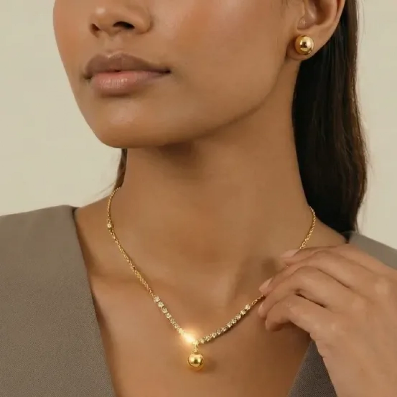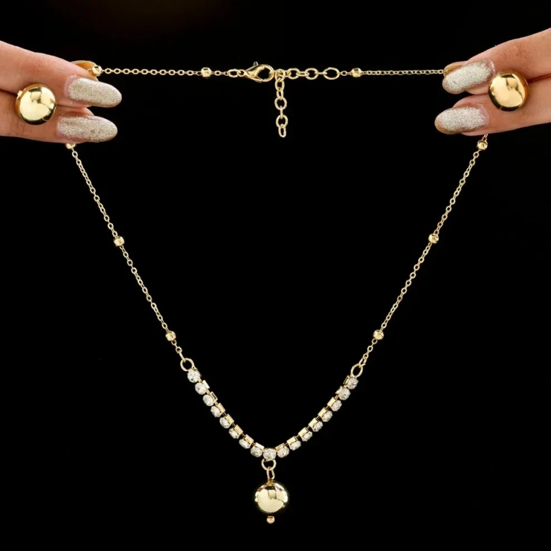Add a touch of effortless sparkle with Ushve’s Rhinestone Ball Pendant Necklace Set, a design that blends modern simplicity with timeless elegance. The delicate rhinestone-lined chain catches the light beautifully, leading to a polished ball pendant that creates a subtle yet eye-catching focal point. The look is completed with sleek gold-tone stud earrings that add a refined balance to the shimmering necklace. Together, the set offers a graceful combination of sparkle and minimal sophistication. Lightweight and versatile, this jewelry set transitions seamlessly from workday elegance to evening styling. Whether paired with modern outfits, festive wear, or simple everyday looks, it reflects Ushve’s signature blend of understated luxury and refined craftsmanship.