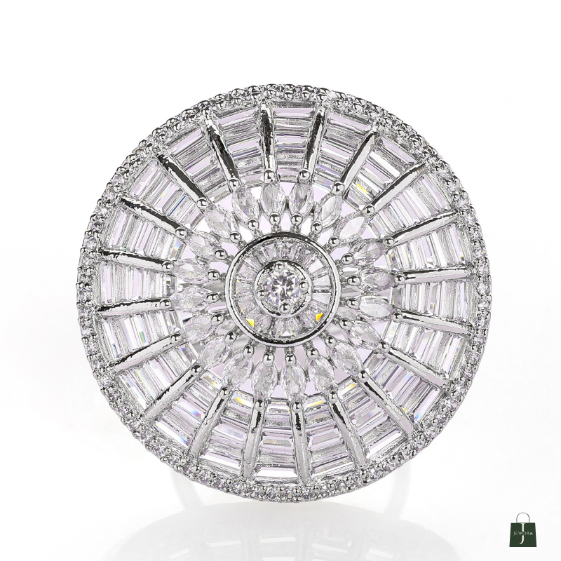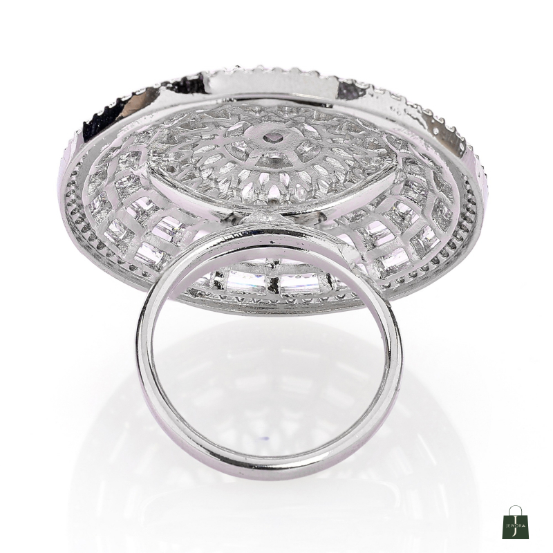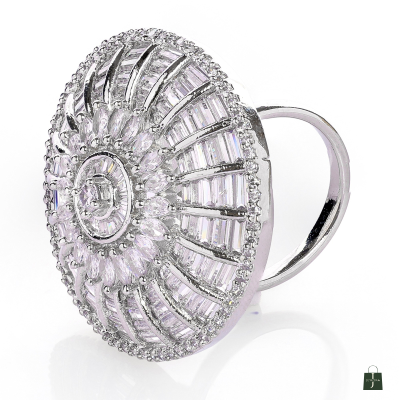 This Round shape adjustable Finger Ring made with Alloy material with rhodium plated , Crafted with a high-quality finish American diamond.