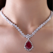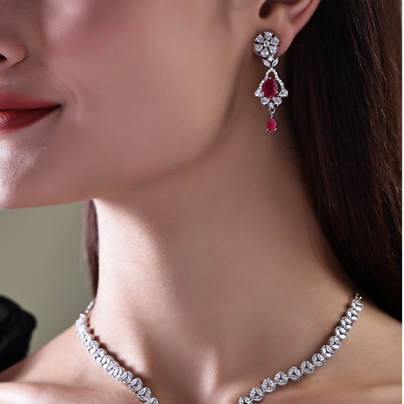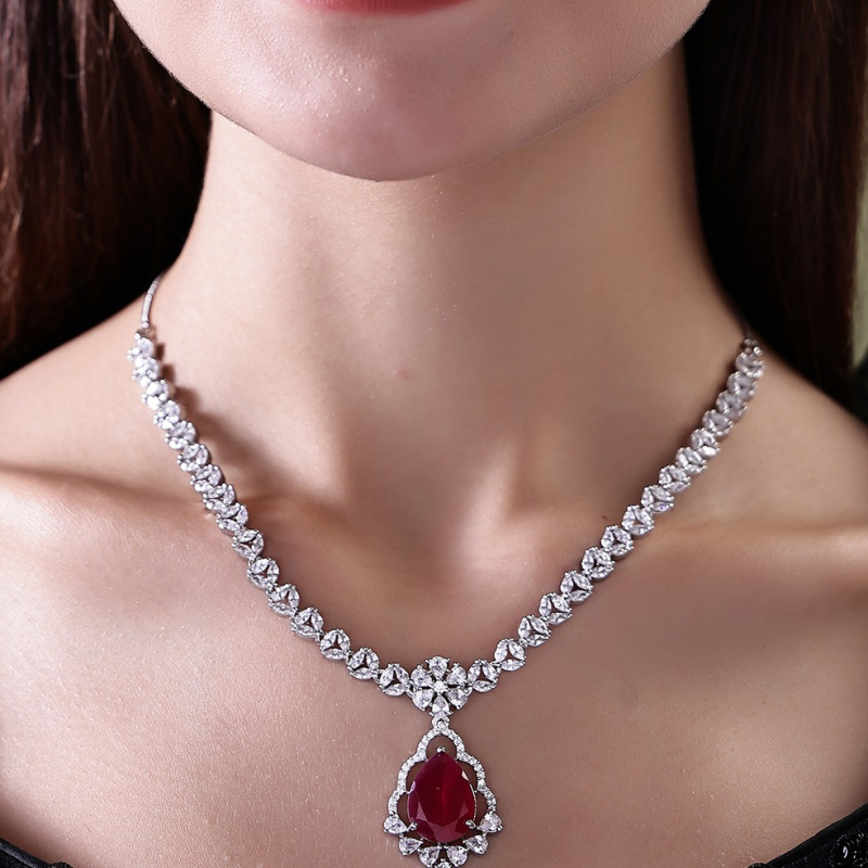 Make a bold statement with this stunning ruby red necklace set, complete with matching earrings for a coordinated and luxurious look. Featuring deep ruby-toned stones accented with sparkling white crystals, this set exudes elegance and timeless charm.