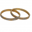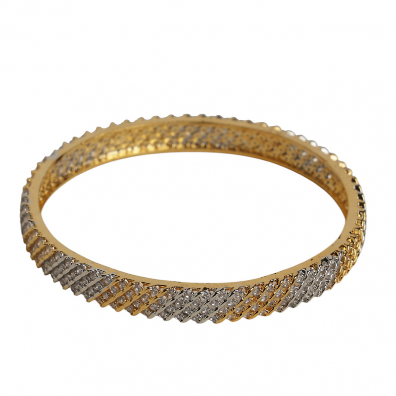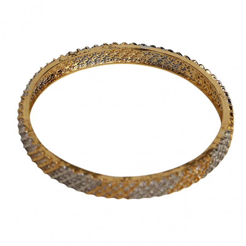 Make a bold yet elegant statement with this stunning dual-tone kada set, crafted with a unique mesh-inspired pattern. Adorned with sparkling crystals in a beautifully interwoven design, these bangles feature a perfect blend of gold and silver tones that enhance their luxurious appeal. Ideal for festive occasions, parties, and weddings, this set adds brilliance and sophistication to any outfit.