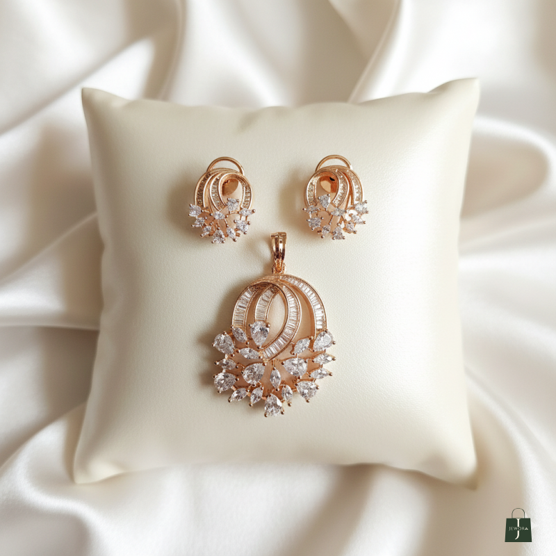 Radiate elegance with this exquisite Rose Gold American Diamond Pendant Set. This contemporary masterpiece features a unique swirl design studded with precision-cut baguette stones, cascading into a brilliant cluster of pear-shaped crystals. The warm rose gold finish complements the sparkling stones, creating a versatile accessory perfect for both office wear and evening galas. Lightweight yet luxurious, this set is a must-have addition to your modern jewelry collection.