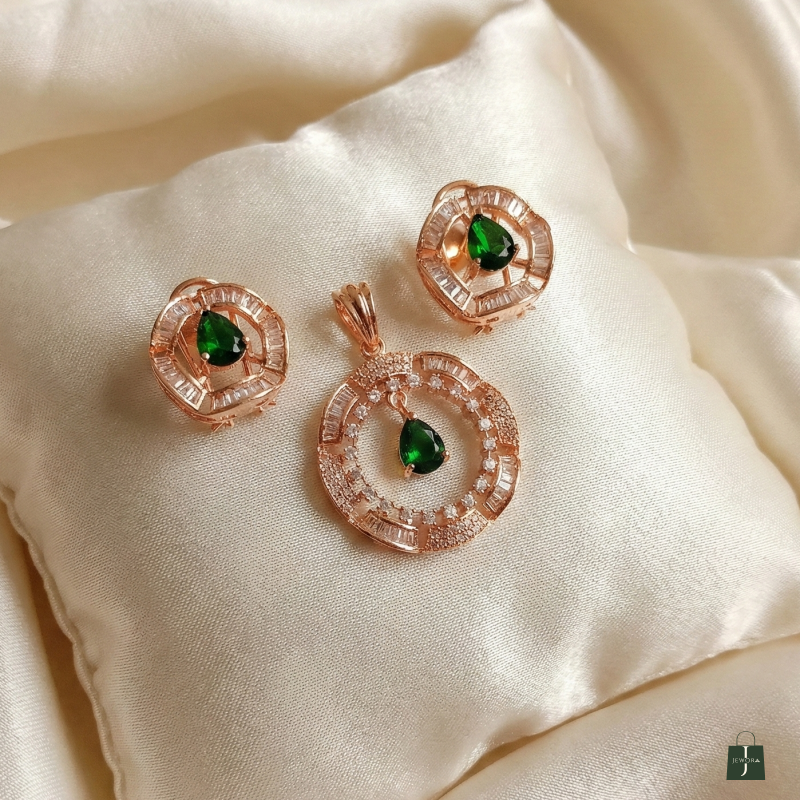 Discover modern luxury with this Rose Gold Halo Set from Ammaira Jewelz. The pendant showcases a circle of precision-cut baguette stones surrounding a suspended, emerald-green teardrop gem. Paired with matching studs featuring a central green stone, this geometric design adds a contemporary yet timeless sparkle to any outfit.