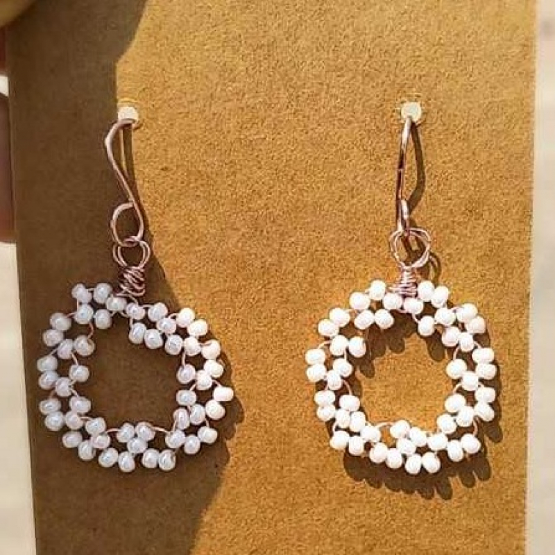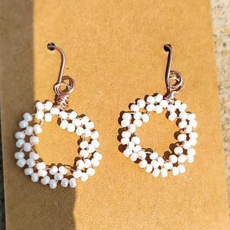 Handcrafted trianular wire-wrapped earrings with rose gold-coloured copper wire frames and a single translucent blue faceted bead at the bottom of each triangle.these minimalist modern design is perfect for casual or everyday wear.