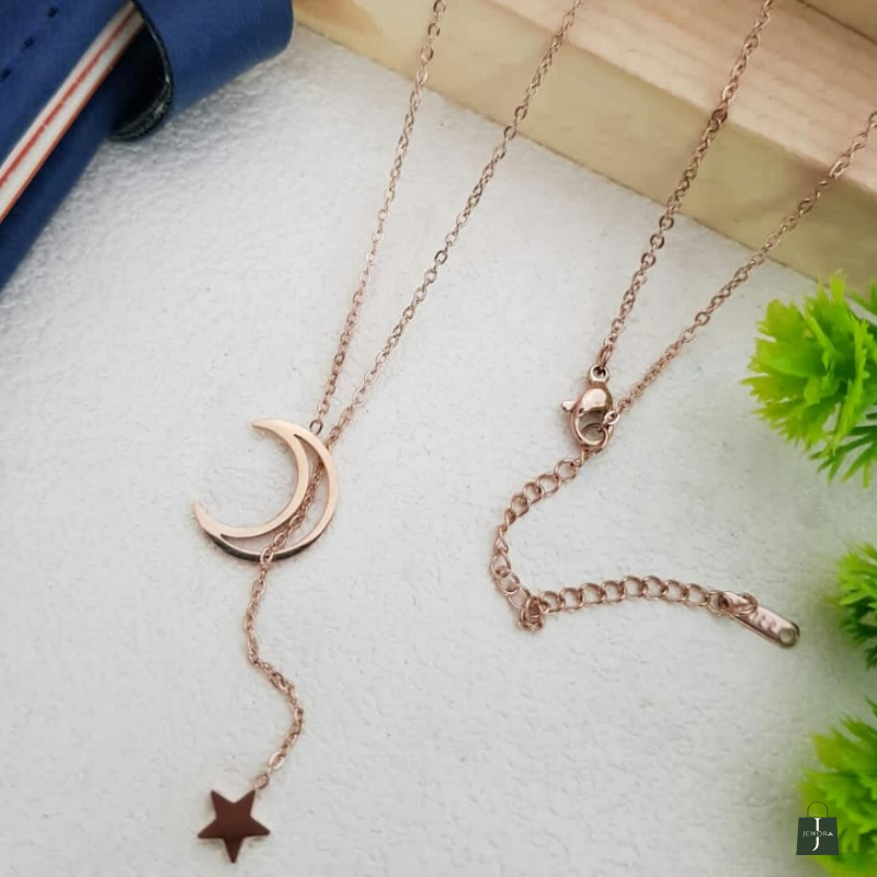 The Rose Gold Crescent Moon & Star Pendant Necklace is inspired by celestial beauty and minimal elegance. The pendant showcases a sleek crescent moon with a delicate hanging star charm, symbolizing dreams, hope, and magic. Its soft rose gold tone adds warmth and sophistication, making it a perfect everyday accessory as well as a stylish piece for evening wear. Lightweight and trendy, this necklace is ideal for women who love modern, minimal jewellery with a touch of fantasy.
