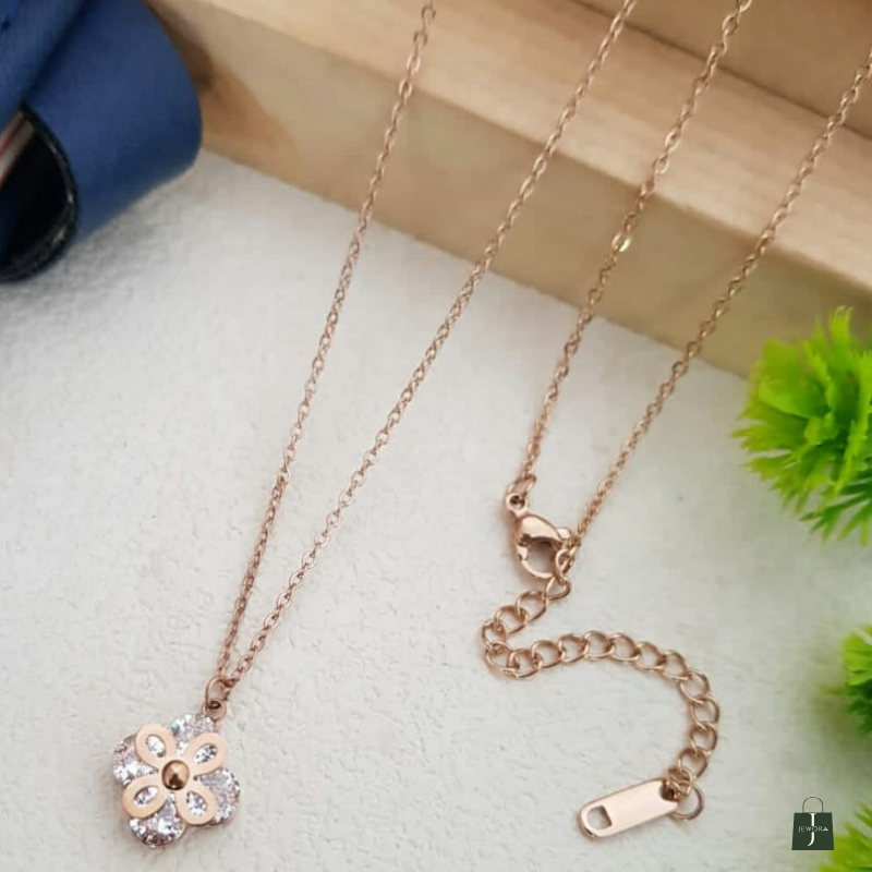 The Rose Gold Crystal Bloom Flower Pendant Necklace is a charming and feminine piece inspired by floral beauty. The pendant features a lovely flower design with shimmering crystal stones arranged in petal form, highlighted with a smooth rose gold outline. Its minimal yet elegant style makes it perfect for everyday wear, office looks, and special occasions. The soft sparkle of crystals adds a graceful shine to your neckline.
