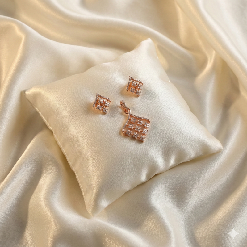 Define your style with this chic geometric pendant and earring set from Ammaira Jewelz. Featuring a stunning rose gold lattice design encrusted with brilliant-cut stones, this set exudes contemporary glamour. The intricate grid pattern reflects light beautifully, offering a sophisticated sparkle that transitions effortlessly from day to night. Perfect for the modern woman who loves understated luxury.