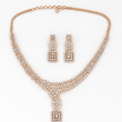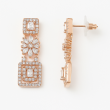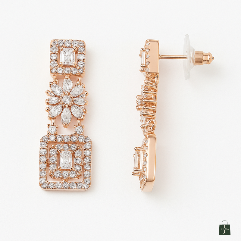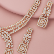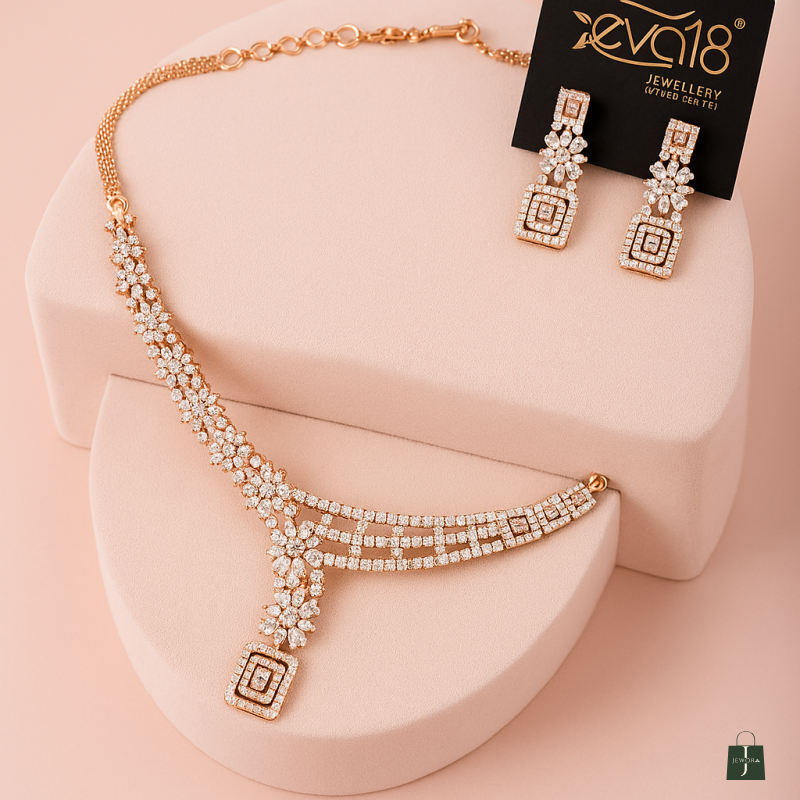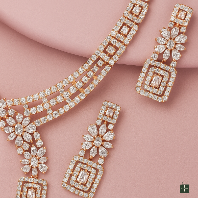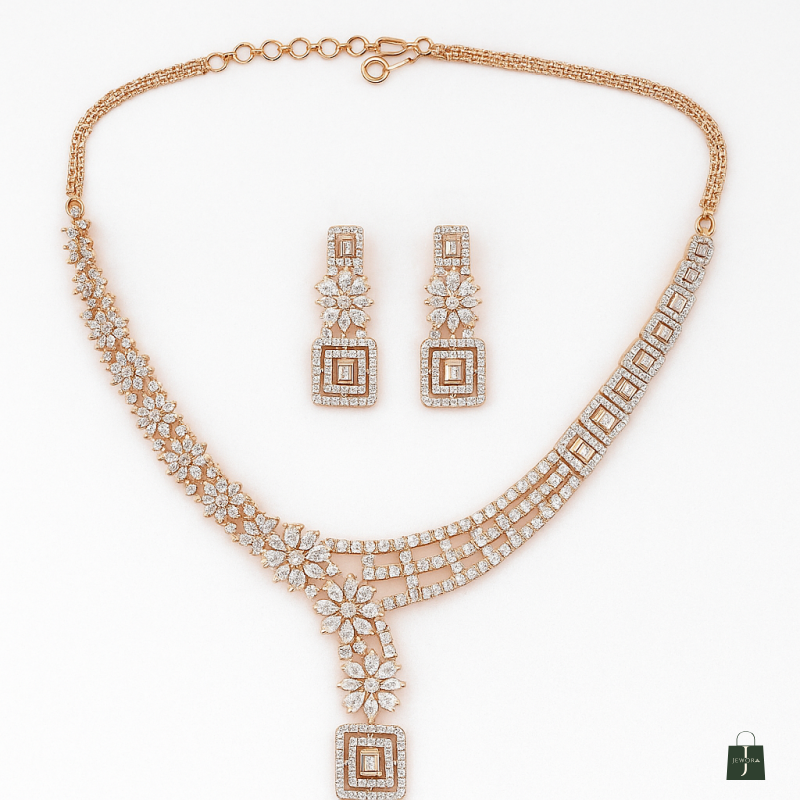 This designer necklace features an asymmetric cascade of floral motifs with American Diamonds (CZ) set in a rose gold base. The right side has a structured grid of square patterns, while the left side flows into delicate floral clusters, ending with a bold square pendant. Matching drop earrings complete the sophisticated look. Ideal for festive and party wear, this modern design is perfect for adding a touch of glamour to your outfits.