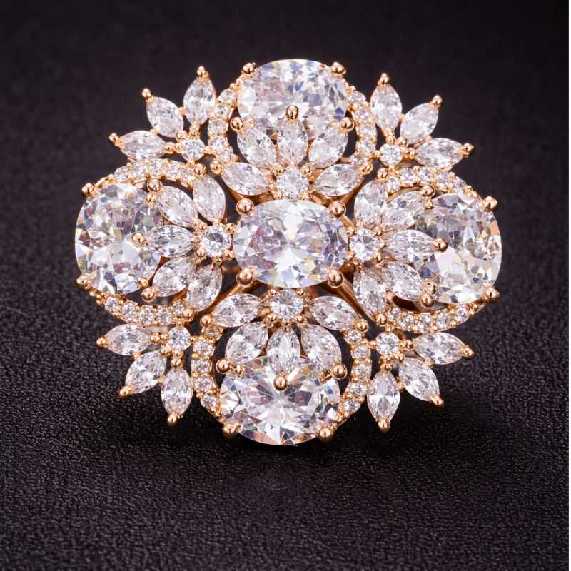 A stunning rose gold-toned cocktail ring featuring a luxurious cluster of sparkling American Diamond (cubic zirconia) stones. The design showcases four large oval-cut center stones arranged around a central marquise stone, surrounded by intricate marquise and round-cut brilliants that create a radiant floral motif. The piece is set in an elegant prisetype metalwork with a bold, adjustable finger fit. Perfect for evening wear or special occasions, it adds glamour and sophistication to any outfit.