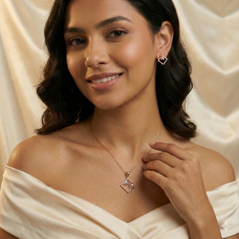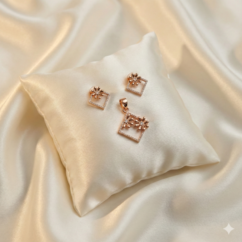 Embrace modern sophistication with this exquisite pendant and earring set from Ammaira Jewelz. Crafted in a lustrous rose gold finish, the design features a geometric square outline studded with shimmering crystals, encasing delicate 3D floral motifs. This contemporary piece perfectly balances structural elegance with feminine charm, making it an ideal accessory for office wear or casual outings.