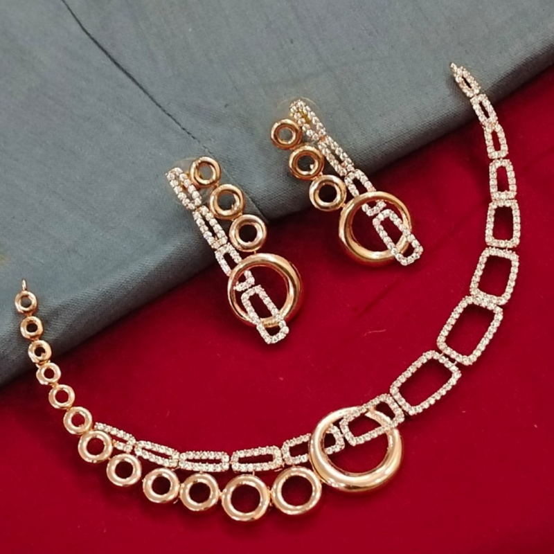 Elegant gold-toned necklace and earring set featuring interlocking circular and rectangular links embellished with sparkling diamond-like stones. The minimalist design offers a modern, luxurious look perfect for everyday wear or special occasions. Crafted with high-quality finish, the set includes a stylish necklace and matching earrings.