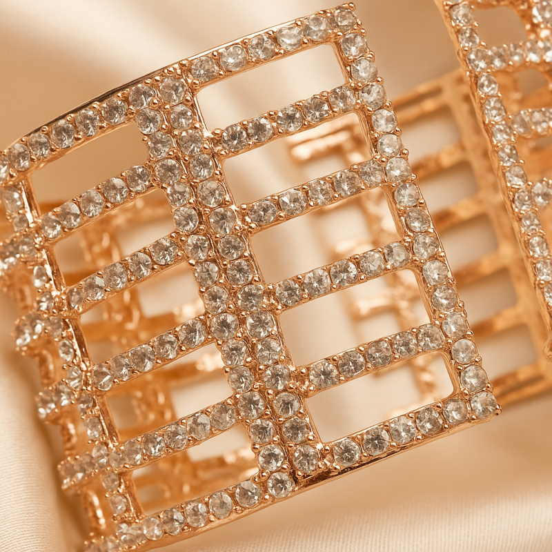 Make a bold fashion statement with the Rose Gold Geometric Open-Cut Statement Cuff Bracelet. Featuring a unique grid-style open-cut design, this wide cuff sparkles with rows of premium American Diamond (CZ) stones that reflect light beautifully. The rose gold plating adds a soft, romantic glow, making this piece perfect for cocktail parties, evening celebrations, or festive gatherings. Lightweight and comfortable to wear, it can be paired with ethnic sarees, lehengas, or even modern gowns for a chic and sophisticated look. Elevate your jewellery collection with this versatile design, exclusively available at Jewora – India’s #1 Artificial Jewellery Marketplace.