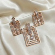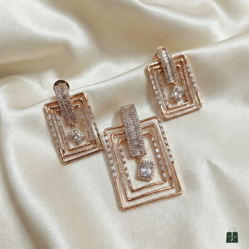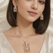 Make a bold statement of sophistication with this rose gold layered geometric pendant and matching earrings set. Featuring an architectural rectangular design with cascading frames, each piece is accented with precision-set baguette and brilliant-cut stones for captivating sparkle. The suspended central diamond adds graceful movement, creating a perfect harmony of structure and elegance. Crafted for contemporary luxury lovers, this set embodies confidence, artistry, and timeless refinement.
